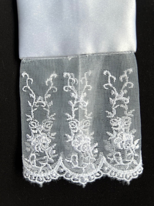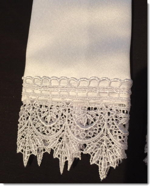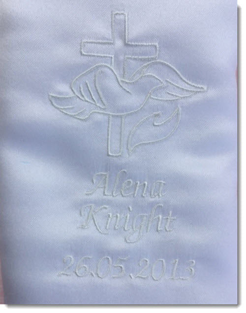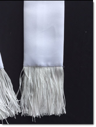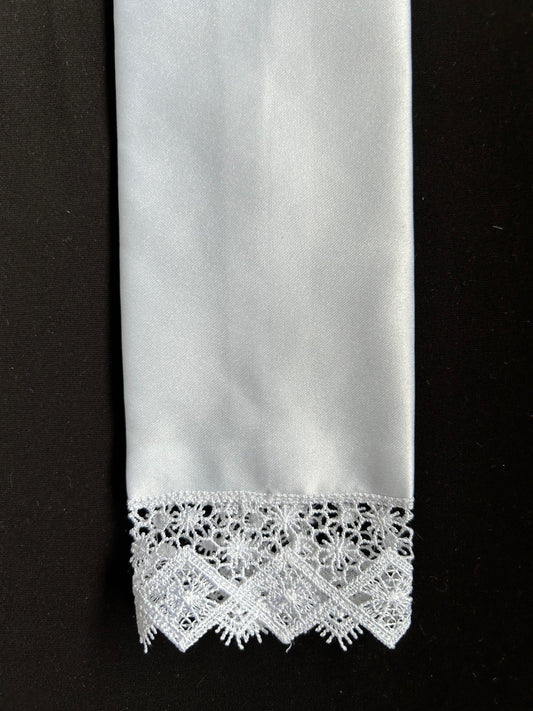 White satin Baptism stole with silver ecclesiastical braid trim.