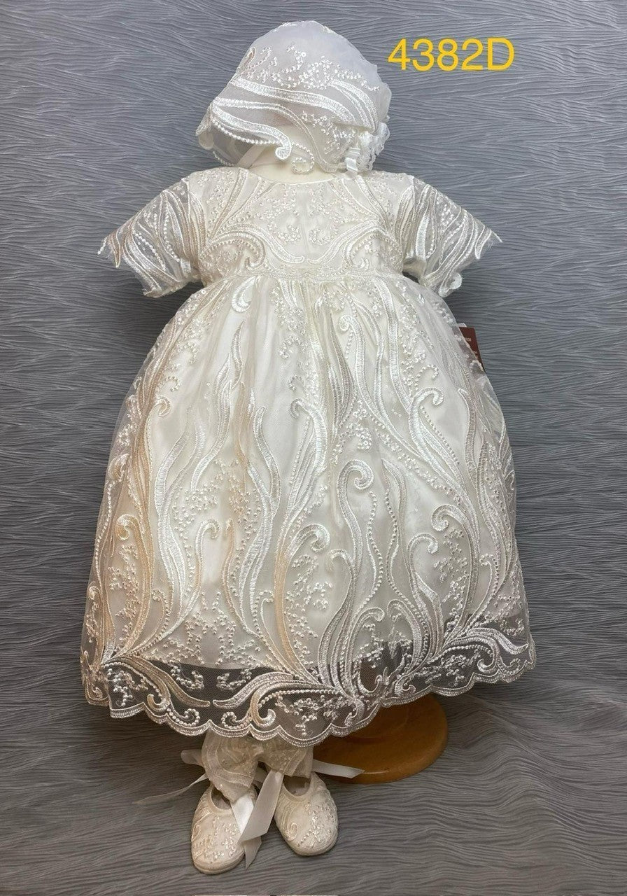 This beautiful christening dress features dreamy floral embroidery and beading on its bridal-quality net lace overlay. Crafted with love from 100% silk, the dress also comes with an adorable matching bonnet, booties and bow headband.