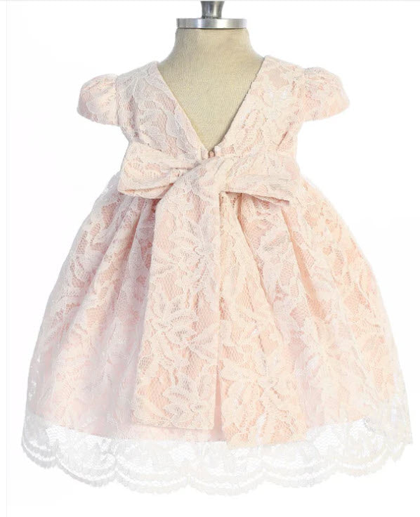 A Nouvelle swirl design lace baby dress with a deep V-back and thick sash in the shape of a cute bow. The bottom is finished with scalloped lace.