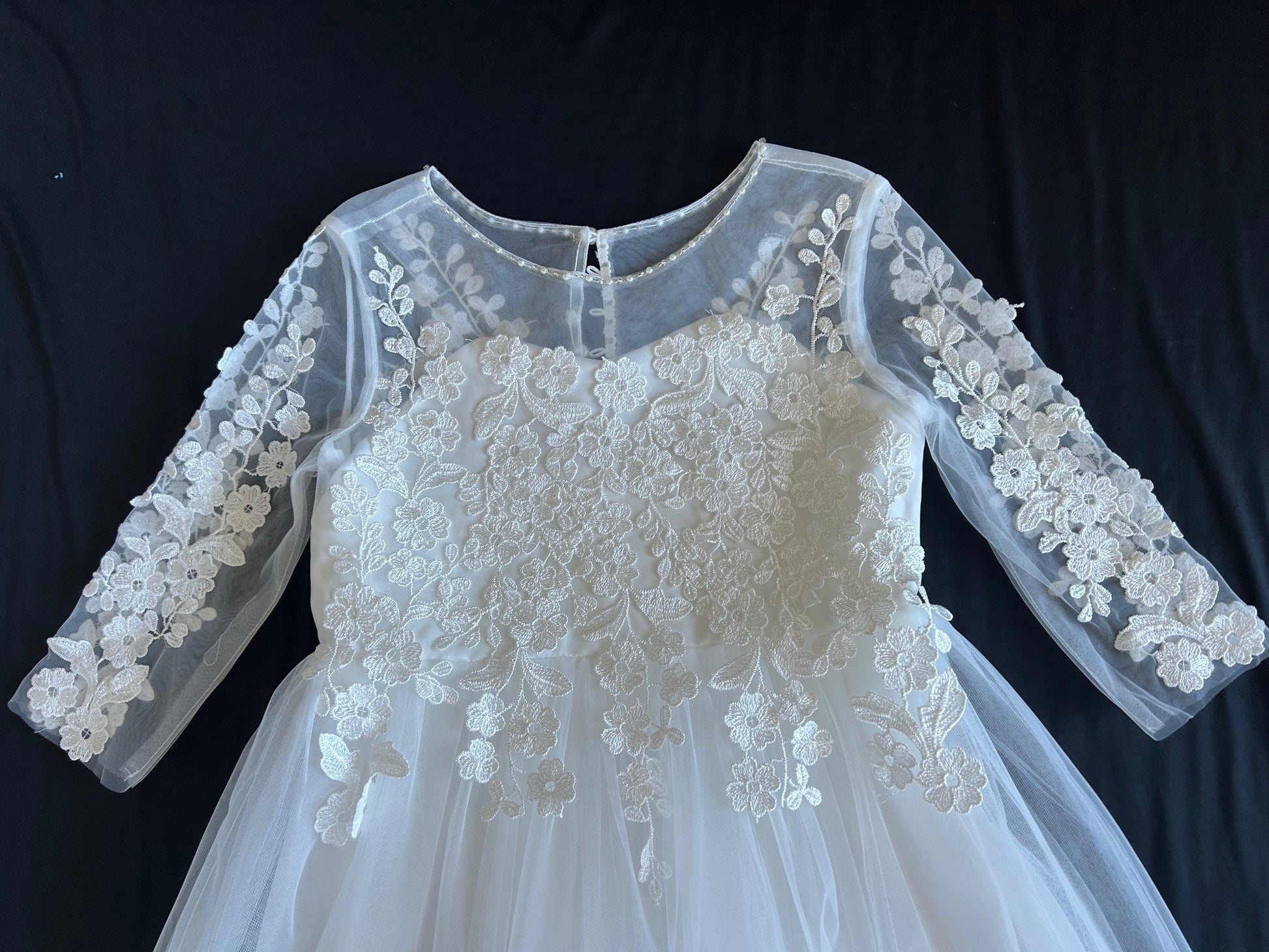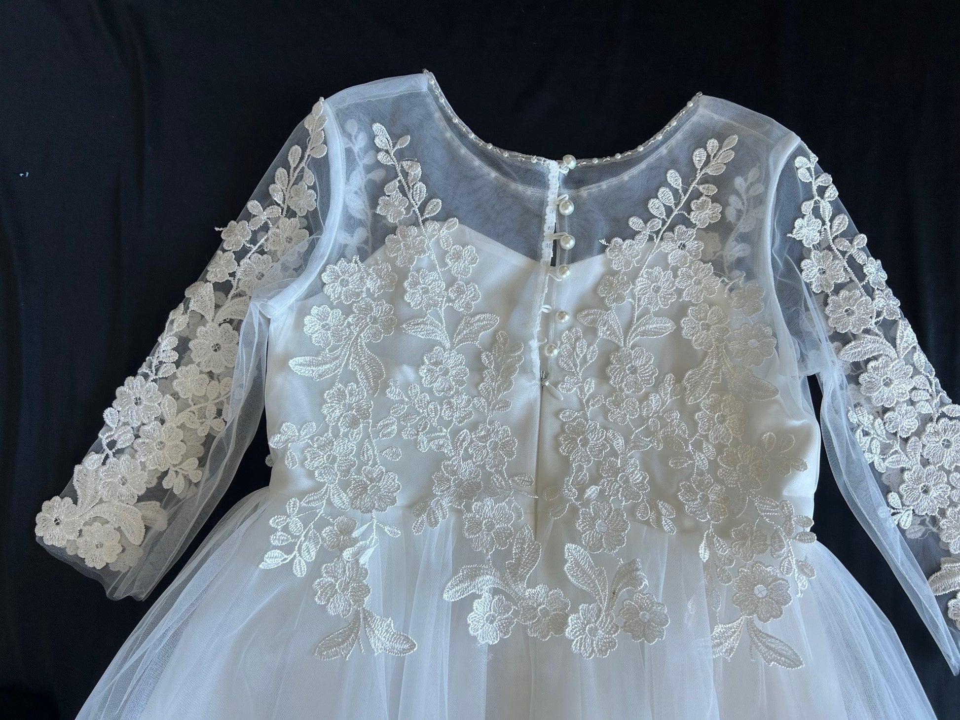 Ivory Long Sleeve First Communion or Flower Girl dress with Lace Applique on the bodice and multi level tulle skirt and beading around the neckline
