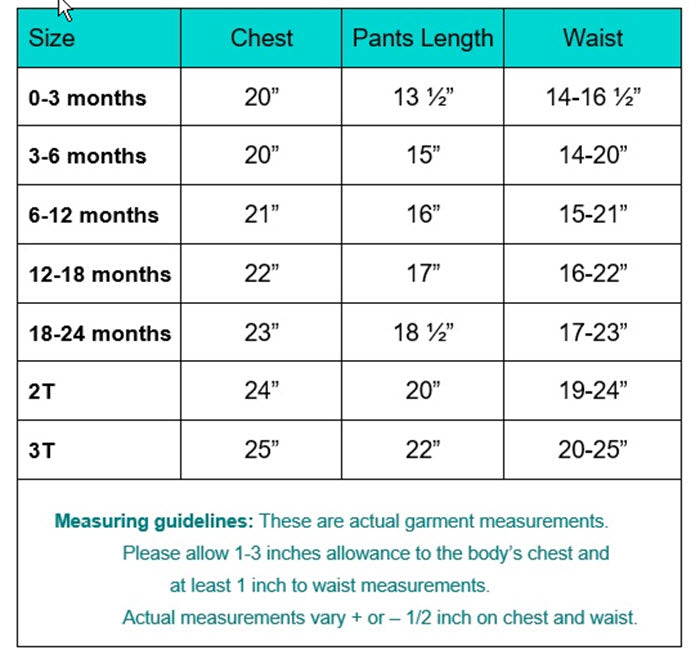 Sizes: 3-6m, 6-12m, 12-18m, 18-24m, 2T, 3T, 4T