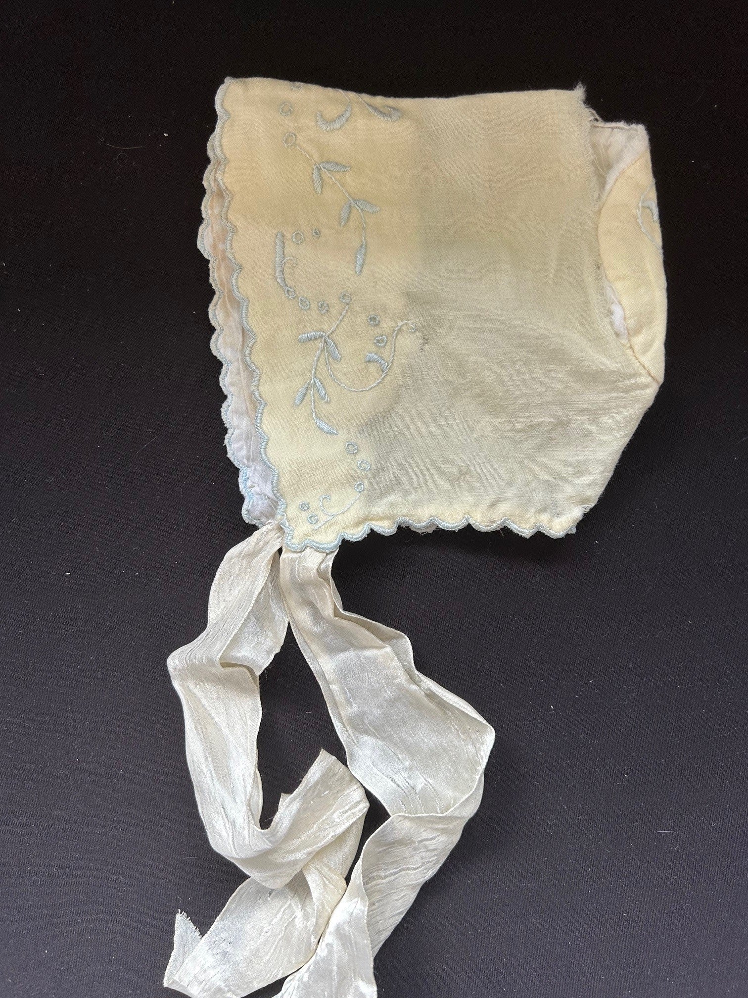 Suitable for Christening or any occasion this beautiful, soft, embroidered voile bonnet has been copied from an antique bonnet (see photos) and features fabric ties